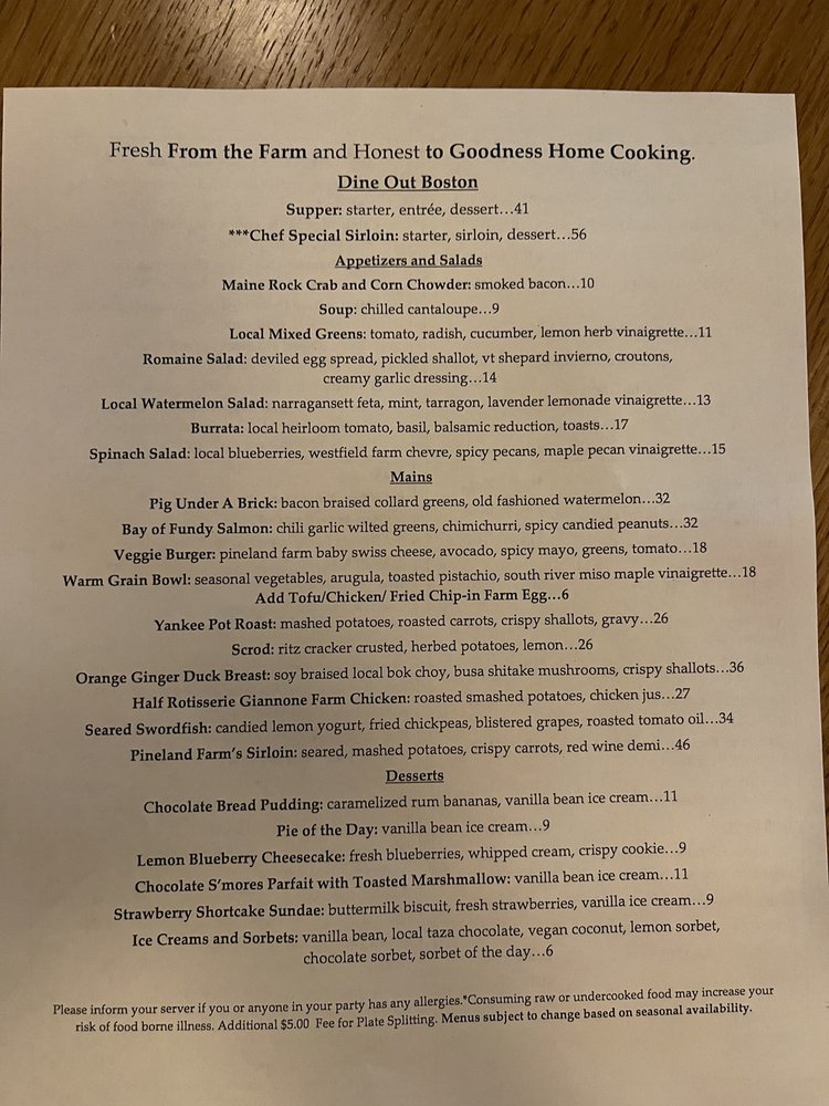 Customer reviews rave about the quality and flavorful dishes, such as tender Scrod on crispy potatoes and refreshing watermelon salad. The menu features unique items like meat and cheese platters and a delicious pork chop with blackberry sauce. Desserts like the key lime pie are also highly recommended.